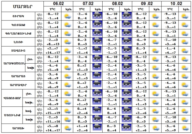 Փետրվարի 6-ին, 9-10-ին սպասվում է առանց տեղումների եղանակ: 7-8-ին շրջանների մեծ մասում սպասվում են տեղումներ: