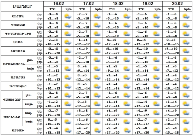 Փետրվարի 16-20-ին սպասվում է առանց տեղումների եղանակ:
