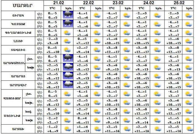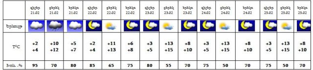 Փետրվարի 21-ին արևմտյան շրջաններում սպասվում են տեղումներ: Փետրվարի 22-25-ին սպասվում է առանց տեղումների եղանակ: Քամին՝ արևմտյան՝ 2-7 մ/վրկ արագությամբ: Օդի ջերմաստիճանը 22-23-ի ցերեկը Լոռիում, Տավուշում, Սյունիքում և Արցախում աստիճանաբար կբարձրանա 5-7, մնացած շրջաններում՝ 2-3 աստիճանով: