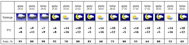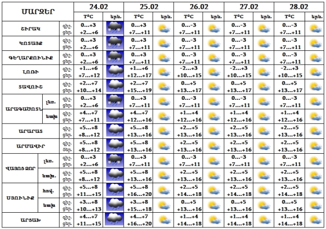Փետրվարի 24-ին շրջանների մեծ մասում սպասվում են տեղումներ: 25-28-ը սպասվում է առանց տեղումների եղանակ: