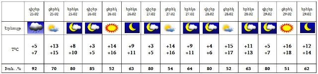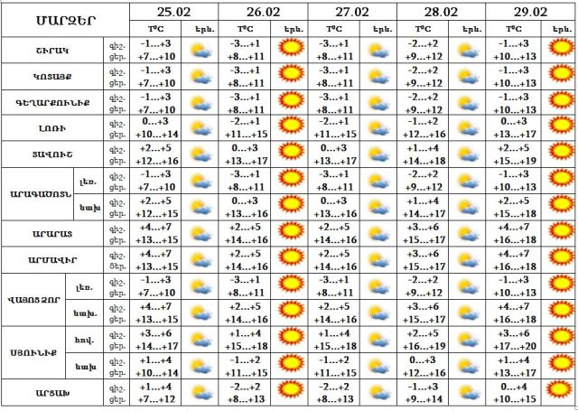 Փետրվարի 25-ի գիշերվա առաջին կեսին շրջանների մեծ մասում սպասվում են տեղումներ: 25-ի ցերեկը, 26-29-ին սպասվում է առանց տեղումների եղանակ: