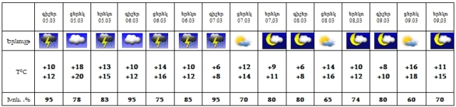 Մարտի 5-6-ը, 7-ի գիշերը սպասվում է անձրև և ամպրոպ, 7-ի ցերեկը, 8-9-ը սպասվում է առանց տեղումների եղանակ: Ամպրոպի ժամանակ հնարավոր է քամու ուժգնացում՝ 15-18 մ/վրկ: