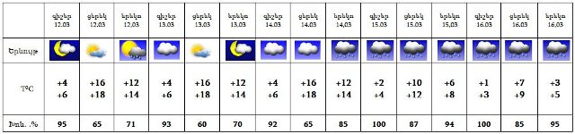 Մարտի 12-ի օրվա երկրորդ կեսին և 13-ի գիշերը հնարավոր է կարճատև անձրև, 14-ի երեկոյան ժամերին, 15-16-ը ժամանակ առ ժամանակ սպասվում է անձրև:
