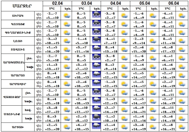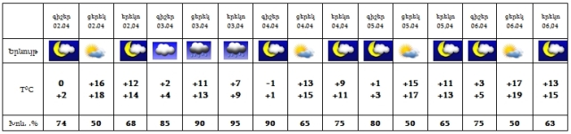 Ապրիլի 2-ին, 4-6-ը սպասվում է առանց տեղումների եղանակ, ապրիլի 3-ի ցերեկը սպասվում է անձրև, հնարավոր է քամու ուժգնացում՝ 18-20 մ/վ արագությամբ: