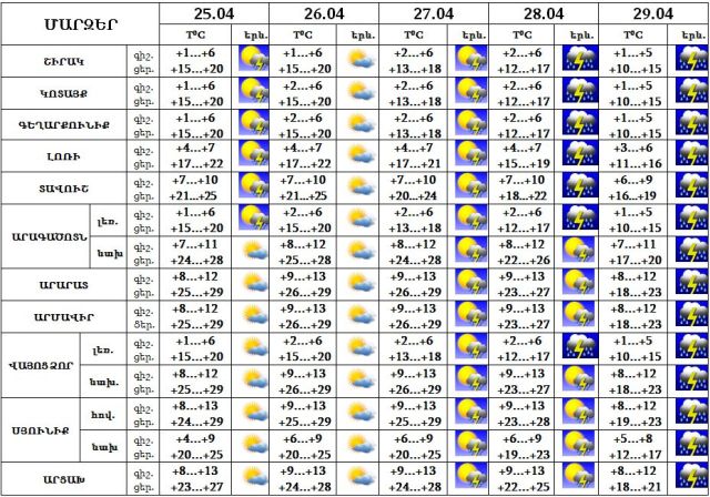 Ապրիլի 27-28-ը երեկոյան ժամերին հնարավոր է կարճատև անձրև և ամպրոպ, 29-ին ժամանակ առ ժամանակ սպասվում է անձրև, ամպրոպի ժամանակ‵ քամու ուժգնացում‵ 18-20 մ/վրկ: