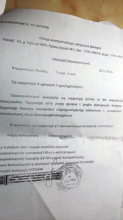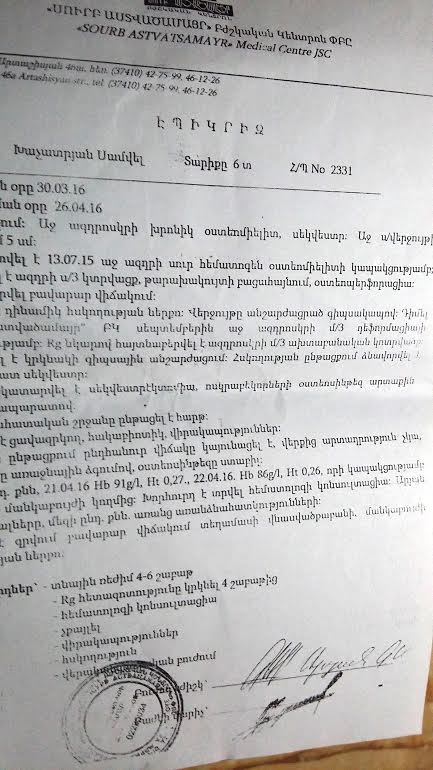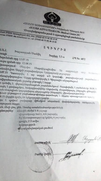 12.07.2015թ. երեխային տեղափոխում են Երևանի Սուրբ Աստվածամայր բժշկական կենտրոն՝ սեպսիս, սեպտիկոպիմեմիա, ազդոսկրի սուր հեմատոգեն օստեոմիելիտ, ազդրի թարախակույտ, երկկողմանի թոքաբորբ ախտորոշմամբ: