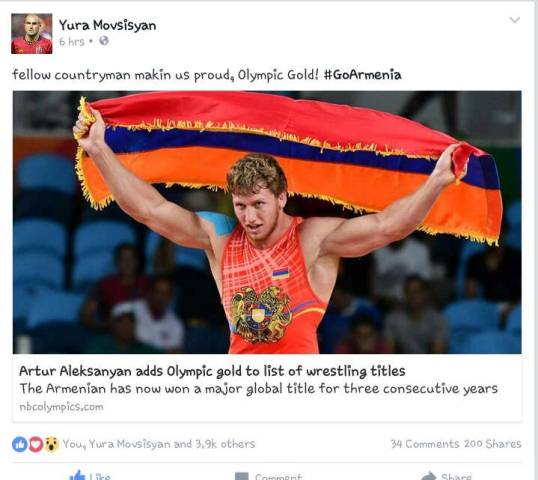 Մովսիսյանն էլ տեղադրել է օլիմպիական չեմպին արթուր Ալեքսանյանի լուսանկարը՝ մակագրելով. «Հայրենակիցս մեզ հպարտացում է, օլիմպիական ոսկի: Հայաստա՛ն, առա՛ջ»: