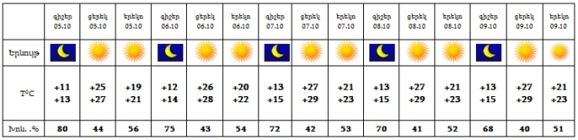 Երևանի հոկտեմբերի 5-ի բազմամյա կլիմայական տվյալներ՝• Օդի առավելագույն ջերմաստիճան` 29.00C (1998 թ.),• Օդի նվազագույն ջերմաստիճան` 1.20C (1987 թ.),• Օդի միջին օրական ջերմաստիճան` 15.40C։