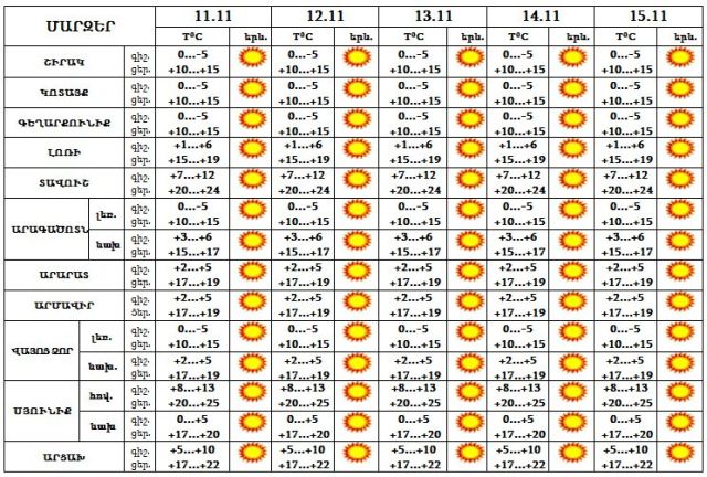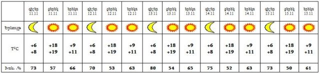 Նոյեմբերի 11-15-ը սպասվում է առանց տեղումների եղանակ: Քամին՝ հարավարևմտյան՝ 3-8 մ/վ արագությամբ:Օդի ջերմաստիճանը 10-11-ը կբարձրանա 1-2 աստիճանով, այնուհետև էապես չի փոխվի: