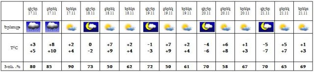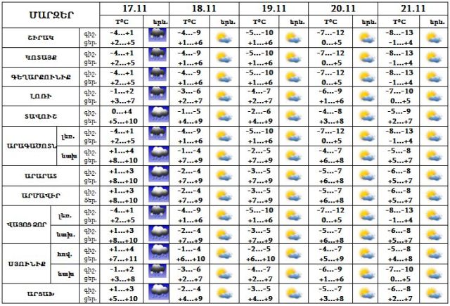 Նոյեմբերի 17-ին ժամանակ առ ժամանակ սպասվում են տեղումներ, 18-21-ը սպասվում է առանց տեղումների եղանակ: