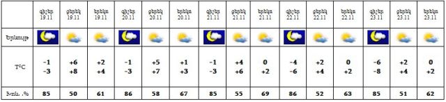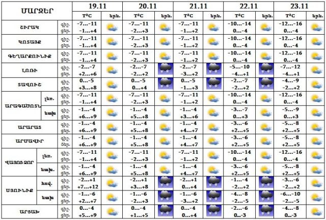 Նոյեմբերի 19-ին և 23-ին սպասվում է առանց տեղումների եղանակ: 20-22-ը Լոռիում, Տավուշում, Սյունիքում և Արցախում սպասվում է թույլ ձյուն: