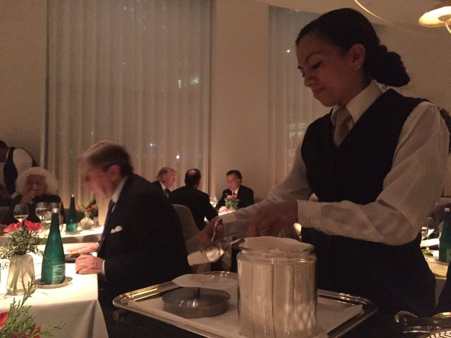 CNN–ի տվյալներով՝ Թրամփը, Ռոմնին և Փրիբասն ընտրել են սխտորով և գորտի թաթերով ապուր, կատարներ, գազարով սուկի՝ ցիտրուսային ջնարակի մեջ, և ոչխարի կոտլետներ՝ սնկային սոուսով։ Որպես աղանդեր՝ երեքն էլ պատվիրել են շոկոլադե տորթ։