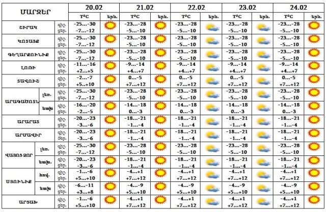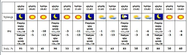 Փետրվարի 20-24-ին սպասվում է առանց տեղումների եղանակ: Քամին՝ հյուսիսարևելյան՝ 3-8 մ/վրկ արագությամբ: