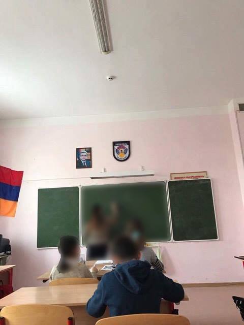 Գրատախտակի վերևում՝ ՀՀ ԶՈՒ զինանշանի կողքին, փակցված է Սերժ Սարգսյանի նկարը: