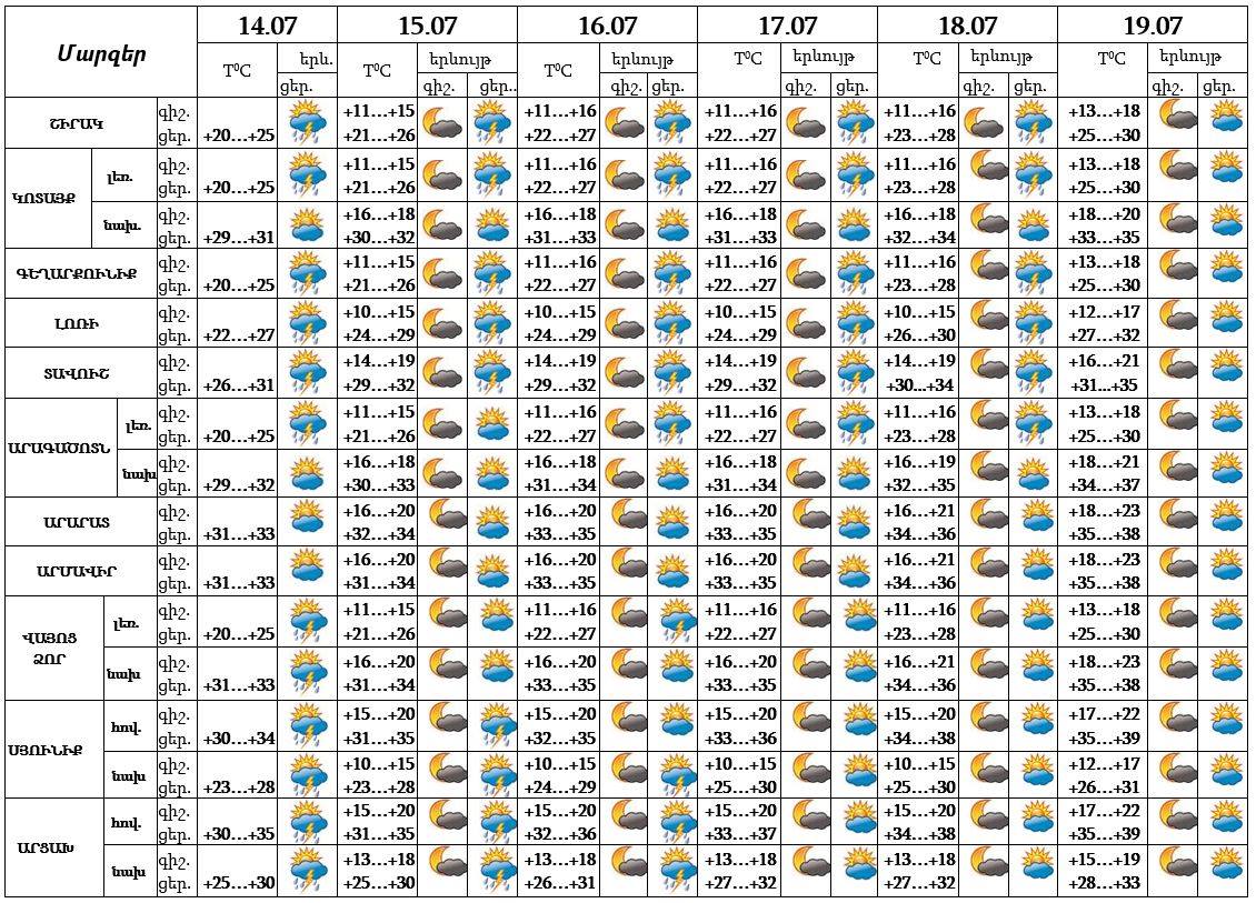 հուլիսի 14-ի ցերեկը շրջանների զգալի մասում, 15-18-ին առանձին շրջաններում գիշերը և կեսօրից հետո սպասվում է կարճատև անձրև և ամպրոպ, ամպրոպի ժամանակ` քամու ուժգնացում՝ 20-25մ/վ: Առանձին վայրերում սպասվում է նաև կարկուտ: Հուլիսի 19-ին սպասվում է առանց տեղումների եղանակ: