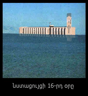 Артур Хайрапетян. «Գիշերը մութ էր ու ջրառատ... աշխատանքի եկավ տարոնը իր փոքրիկ նավակով... սիրուն չի տարոն.- ասաց սերժիկը ձեռնախոսով. տարոնն էլ, թե՝ բա ես ինչ անեմ, ջրերս գնաց... սիրուն չի տարոն, տղաս, հո դու տհաս չես... երգում էր մայր կկուն... տարոնը որոշեց տապան կառուցել, այժմ քաղաքապետարանում հավաքագրվում են շատերը, որ տապանում տեղ ունենան ապրելու... ջրերը այժմ ցամաքել են, երեկոյան սպասվում է քաղաքապետարանում տապանի կառուցման նախագԾատերերին քննարկում... երազ, թե իրականություն? ՀՀԿ-ն հոգեխանգարմունքի մեջ վիժում է, հասեք... ջրերը գնաց»։