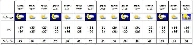 Սեպտեմբերի 8-11-ին սպասվում է առանց տեղումների եղանակ, 12-ի երեկոյան ժամերին և գիշերը սպասվում է կարճատև անձրև և ամպրոպ: