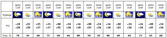 Սեպտեմբերի 12-16-ին երեկոյան ժամերին սպասվում է ամպրոպ, անձրևի հավանականությունը փոքր է: