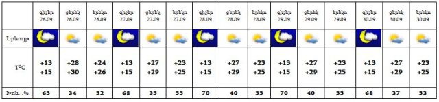 Սեպտեմբերի 26-30-ին հյուսիսային առանձին շրջաններում գիշերը և երեկոյան ժամերին հնարավոր է կարճատև անձրև և ամպրոպ: