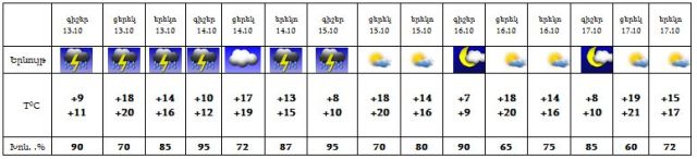 Երևանում`Հոկտեմբերի 13-14-ին ժամանակ առ ժամանակ սպասվում է կարճատև անձրև և ամպրոպ, ամպրոպի ժամանակ հնարավոր է քամու ուժգնացում` 16-18 մ/վրկ: 15-17-ին սպասվում է առանց տեղումների եղանակ: