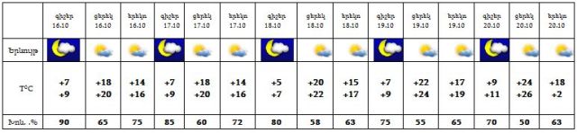 Օդի ջերմաստիճանը 16-18-ի գիշերը աստիճանաբար կնվազի 4-6 աստիճանով, 17-ի ցերեկը արևելյան շրջաններում` 4-5 աստիճանով, 18-ի ցերեկը, 19-20-ին աստիճանաբար կբարձրանա 4-6, արևելյան շրջաններում` 8-10 աստիճանով: