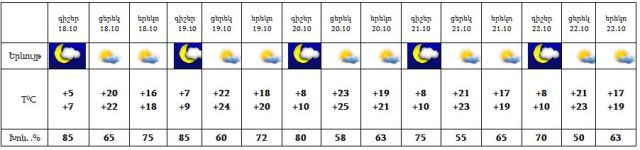 Հոկտեմբերի 18-22-ին սպասվում է առանց տեղումների եղանակ:Քամին՝ հյուսիս-արևելյան‵ 2-5 մ/վրկ: Օդի ջերմաստիճանը 18-20-ին աստիճանաբար կբարձրանա 5-6, արևելյան շրջաններում 9-11 աստիճանով: