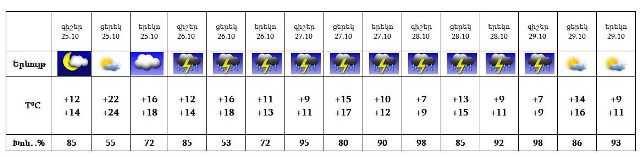Հոկտեմբերի 25-ին առանձին շրջաններում սպասվում է թույլ անձրև, 26-28-ին շրջանների զգալի մասում, 29-ին արևելյան շրջաններում ժամանակ առ ժամանակ սպասվում է անձրև և ամպրոպ: Քամին՝ հարավ-արևմտյան‵ 2-5 մ/վրկ, ամպրոպի ժամանակ‵ 15-20մ/վրկ: