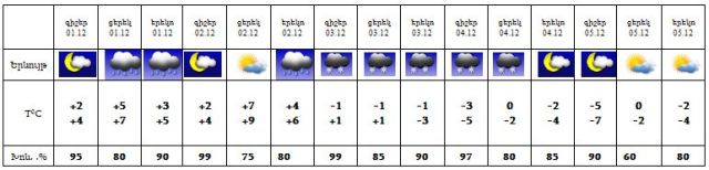 Դեկտեմբերի 1-ին, 2-ի երեկոյան ժամերին, 3-ին, 4-ին ժամանակ առ ժամանակ սպասվում են տեղումներ, 2-ի ցերեկը, 5-ին սպասվում է առանց տեղումների եղանակ: