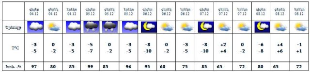 Դեկտեմբերի 4-ին առավելապես արևելյան շրջաններում, 5-ին շրջանների մեծ մասում սպասվում է թույլ ձյուն: 6-8-ին սպասվում է առանց տեղումների եղանակ: