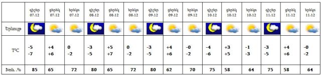 Դեկտեմբերի 7-11-ը սպասվում է առանց տեղումների եղանակ: Քամին՝ հյուսիս-արևմտյան‵ 2-7 մ/վրկ արագությամբ: Օդի ջերմաստիճանը 7-8-ին կբարձրանա 2-4 աստիճանով: