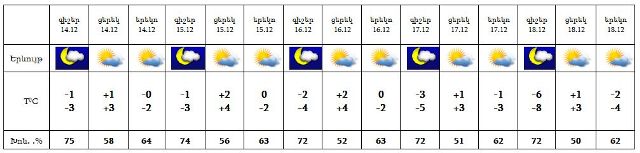 Դեկտեմբերի 14-18-ին սպասվում է առավելապես առանց տեղումների եղանակ: