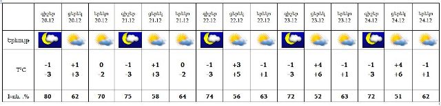 Դեկտեմբերի 20-24-ին սպասվում է առանց տեղումների եղանակ: Քամին՝ հյուսիս-արևմտյան‵ 2-7 մ/վրկ արագությամբ: