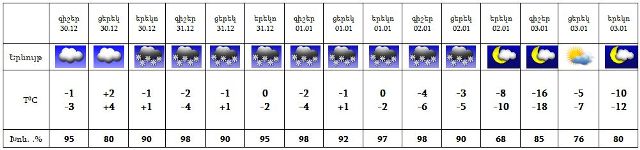 Դեկտեմբերի 30-ի գիշերը, հունվարի 3-ին սպասվում է առանց տեղումների եղանակ: Դեկտեմբերի 30-ի ցերեկը, 31-ից հունվարի 2-ին սպասվում է ձյուն: