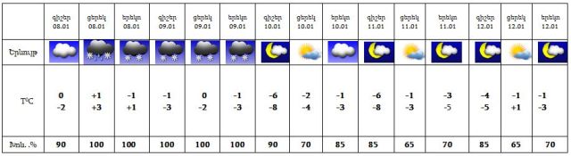 Քամին՝ արևմտյան‵ 2-7 մ/վրկ արագությամբ, առանձին հատվածներում քամու ուժգնացում՝ 15-20մ/վրկ. օդի ջերմաստիճանը հունվարի 8-ի գիշերը կբարձրանա, ցերեկը՝ 2-4, 10-ին կնվազի 3-6 աստիճանով: