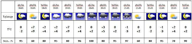 Հունվարի 18-ին, 22-ին, 21-ի ցերեկը սպասվում է առանց տեղումների եղանակ: Հունվարի 19-20-ին 21-ի գիշերը շրջանների զգալի մասում սպասվում են տեղումներ, լեռնային շրջաններում՝ ձյուն, հովտային և նախալեռնային շրջաններում՝ ձնախառն անձրև և անձրև: Քամին՝ հարավ-արևմտյան‵ 2-7 մ/վրկ արագությամբ, 19-ին առանձին վայրերում քամու ուժգնացում՝ 20-25մ/վրկ արագությամբ: Օդի ջերմաստիճանը 18-ին և 19-ի գիշերը կբարձրանա 5-7 աստիճանով, 20-21-ին կնվազի 4-6 աստիճանով: