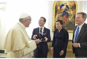 Папа Римский Франциск встретился с основателем социальной сети «Facebook» Марком Цукербергом и его супругой Присциллой Чан, сообщают СМИ Ватикана.